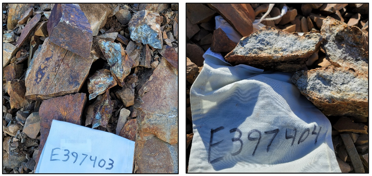 Figure 3. Sample E397403 – 5.5 g/t Au and 6.9% Cu; Sample E397404 – 15.5 g/t Au